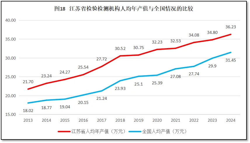 江苏省检验检测机构人均年产值与全国的情况比较如图18所示。